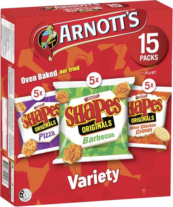 Includes 5 packs each of Arnott’s Shapes Originals Barbecue, Pizza and Mini Chicken Crimpy flavours.