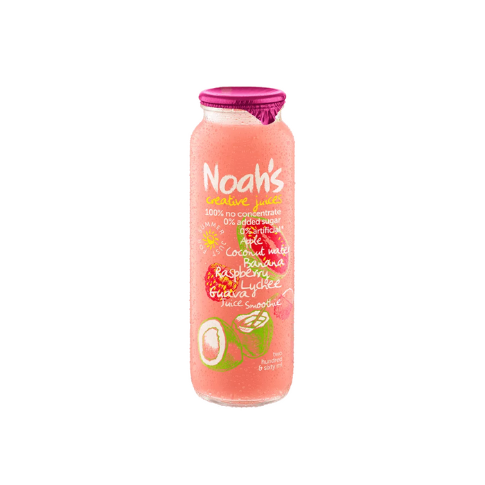 - Noahs Apple Coconut Water-Lychee-Raspberry Banana-Lychee Guava Juice Smoothie Glass Bottles (12x260ml)