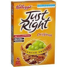 With a blend of wholesome grains, sultanas and apricot pieces, Kellogg's Just Right with fresh milk is the ideal, perfectly balanced, healthy breakfast cereal to start your day.